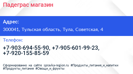 Падеграс, магазин по адресу 300041, Тульская область, Тула, Советская, 4 в дальнейшем Организация, размещена в следующих категориях: