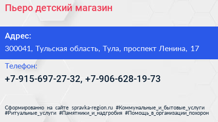 Пьеро, детский магазин по адресу 300041, Тульская область, Тула, проспект Ленина, 17 в дальнейшем Организация, размещена в следующих категориях: