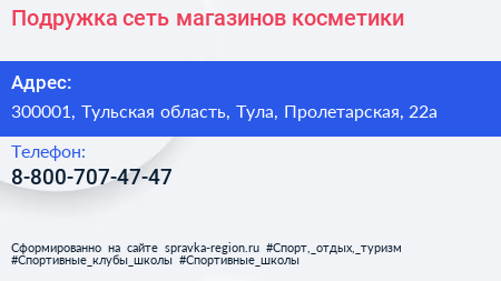 Подружка, сеть магазинов косметики по адресу 300001, Тульская область, Тула, Пролетарская, 22а в дальнейшем Организация, размещена в следующих категориях: