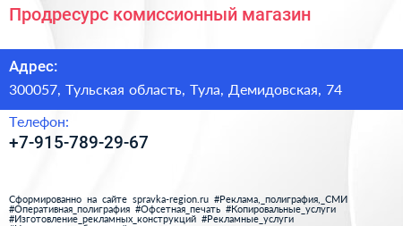 Продресурс, комиссионный магазин по адресу 300057, Тульская область, Тула, Демидовская, 74 в дальнейшем Организация, размещена в следующих категориях: