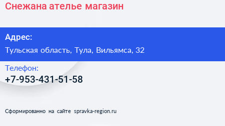 Снежана, ателье-магазин по адресу Тульская область, Тула, Вильямса, 32 в дальнейшем Организация, размещена в следующих категориях: