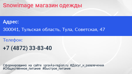 Snowimage, магазин одежды по адресу 300041, Тульская область, Тула, Советская, 47 в дальнейшем Организация, размещена в следующих категориях: