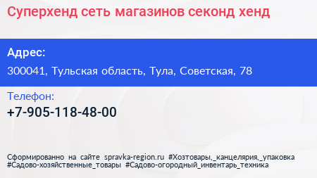 Суперхенд, сеть магазинов секонд-хенд по адресу 300041, Тульская область, Тула, Советская, 78 в дальнейшем Организация, размещена в следующих категориях: