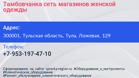Тамбовчанка, сеть магазинов женской одежды по адресу 300001, Тульская область, Тула, Ложевая, 129 в дальнейшем Организация, размещена в следующих категориях: