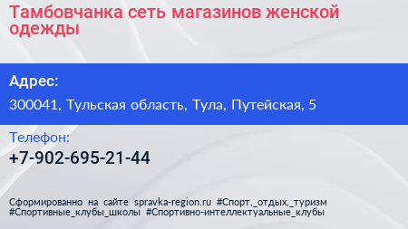 Тамбовчанка, сеть магазинов женской одежды по адресу 300041, Тульская область, Тула, Путейская, 5 в дальнейшем Организация, размещена в следующих категориях: