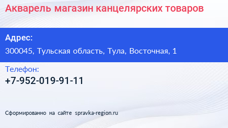 Акварель, магазин канцелярских товаров по адресу 300045, Тульская область, Тула, Восточная, 1 в дальнейшем Организация, размещена в следующих категориях: