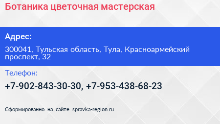 Ботаника, цветочная мастерская по адресу 300041, Тульская область, Тула, Красноармейский проспект, 32 в дальнейшем Организация, размещена в следующих категориях: