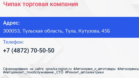 Чипак, торговая компания по адресу 300053, Тульская область, Тула, Кутузова, 45Б в дальнейшем Организация, размещена в следующих категориях: