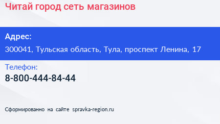 Читай город, сеть магазинов по адресу 300041, Тульская область, Тула, проспект Ленина, 17 в дальнейшем Организация, размещена в следующих категориях: