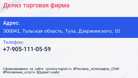 Делиз, торговая фирма по адресу 300041, Тульская область, Тула, Дзержинского, 10 в дальнейшем Организация, размещена в следующих категориях: