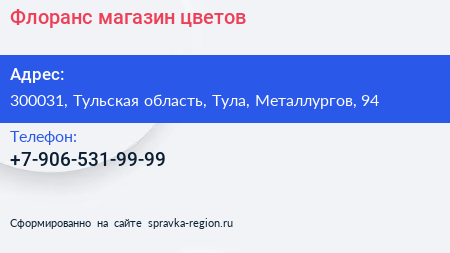 Флоранс, магазин цветов по адресу 300031, Тульская область, Тула, Металлургов, 94 в дальнейшем Организация, размещена в следующих категориях: