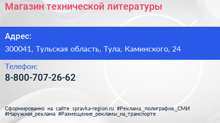 Магазин технической литературы по адресу 300041, Тульская область, Тула, Каминского, 24 в дальнейшем Организация, размещена в следующих категориях: