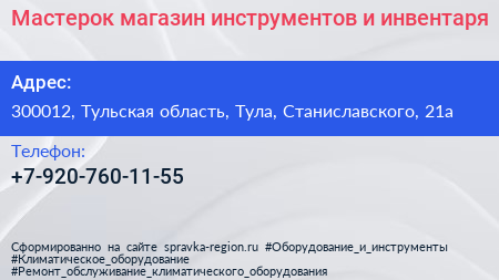 Мастерок, магазин инструментов и инвентаря по адресу 300012, Тульская область, Тула, Станиславского, 21а в дальнейшем Организация, размещена в следующих категориях: