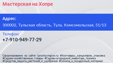 Мастерская на Хопре по адресу 300002, Тульская область, Тула, Комсомольская, 51/13 в дальнейшем Организация, размещена в следующих категориях: