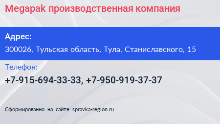 Megapak, производственная компания по адресу 300026, Тульская область, Тула, Станиславского, 15 в дальнейшем Организация, размещена в следующих категориях: