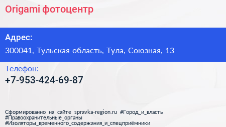 Origami, фотоцентр по адресу 300041, Тульская область, Тула, Союзная, 13 в дальнейшем Организация, размещена в следующих категориях: