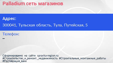 Palladium, сеть магазинов по адресу 300041, Тульская область, Тула, Путейская, 5 в дальнейшем Организация, размещена в следующих категориях: