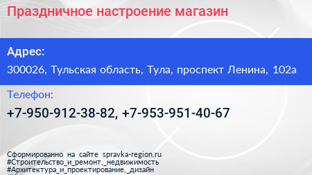 Праздничное настроение, магазин по адресу 300026, Тульская область, Тула, проспект Ленина, 102а в дальнейшем Организация, размещена в следующих категориях: