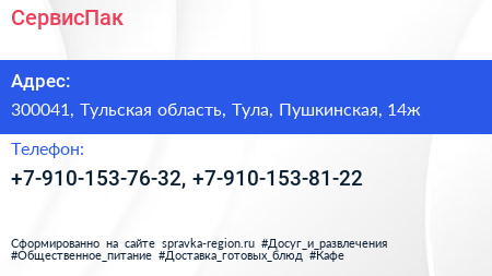 СервисПак по адресу 300041, Тульская область, Тула, Пушкинская, 14ж в дальнейшем Организация, размещена в следующих категориях: