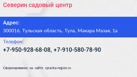Северин, садовый центр по адресу 300016, Тульская область, Тула, Макара Мазая, 1а в дальнейшем Организация, размещена в следующих категориях: