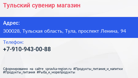 Тульский сувенир, магазин по адресу 300028, Тульская область, Тула, проспект Ленина, 94 в дальнейшем Организация, размещена в следующих категориях:
