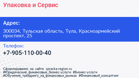 Упаковка и Сервис по адресу 300034, Тульская область, Тула, Красноармейский проспект, 25 в дальнейшем Организация, размещена в следующих категориях: