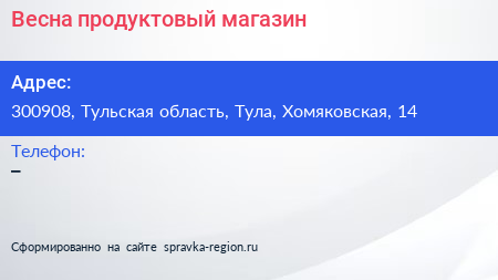 Весна, продуктовый магазин по адресу 300908, Тульская область, Тула, Хомяковская, 14 в дальнейшем Организация, размещена в следующих категориях: