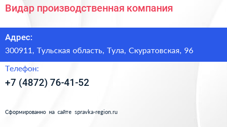 Видар, производственная компания по адресу 300911, Тульская область, Тула, Скуратовская, 96 в дальнейшем Организация, размещена в следующих категориях: