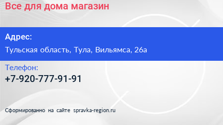 Все для дома, магазин по адресу Тульская область, Тула, Вильямса, 26а в дальнейшем Организация, размещена в следующих категориях: