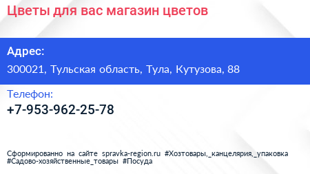 Цветы для вас, магазин цветов по адресу 300021, Тульская область, Тула, Кутузова, 88 в дальнейшем Организация, размещена в следующих категориях: