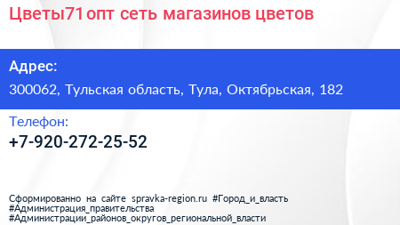 Цветы71.опт, сеть магазинов цветов по адресу 300062, Тульская область, Тула, Октябрьская, 182 в дальнейшем Организация, размещена в следующих категориях: