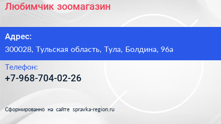 Любимчик, зоомагазин по адресу 300028, Тульская область, Тула, Болдина, 96а в дальнейшем Организация, размещена в следующих категориях: