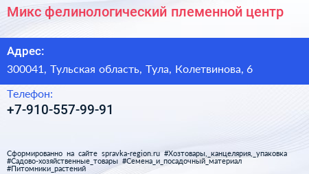 Микс, фелинологический племенной центр по адресу 300041, Тульская область, Тула, Колетвинова, 6 в дальнейшем Организация, размещена в следующих категориях: