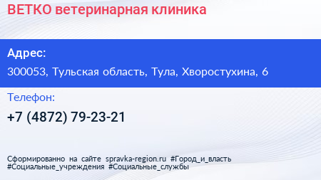 ВЕТКО, ветеринарная клиника по адресу 300053, Тульская область, Тула, Хворостухина, 6 в дальнейшем Организация, размещена в следующих категориях: