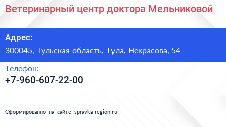 Ветеринарный центр доктора Мельниковой по адресу 300045, Тульская область, Тула, Некрасова, 54 в дальнейшем Организация, размещена в следующих категориях: