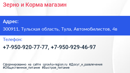 Зерно и Корма, магазин по адресу 300911, Тульская область, Тула, Автомобилистов, 4в в дальнейшем Организация, размещена в следующих категориях: