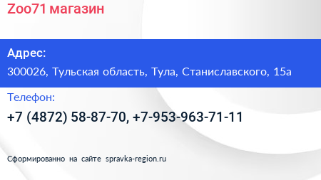 Zoo71, магазин по адресу 300026, Тульская область, Тула, Станиславского, 15а в дальнейшем Организация, размещена в следующих категориях: