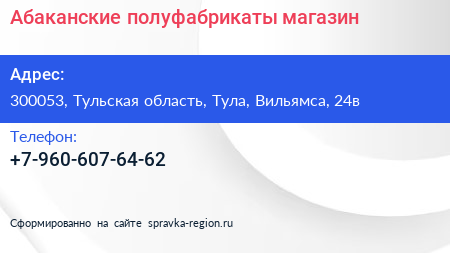Абаканские полуфабрикаты, магазин по адресу 300053, Тульская область, Тула, Вильямса, 24в в дальнейшем Организация, размещена в следующих категориях: