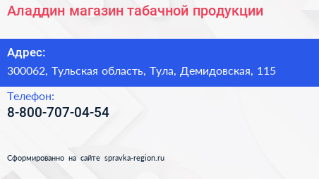 Аладдин, магазин табачной продукции по адресу 300062, Тульская область, Тула, Демидовская, 115 в дальнейшем Организация, размещена в следующих категориях:
