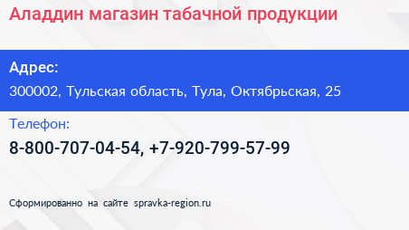 Аладдин, магазин табачной продукции по адресу 300002, Тульская область, Тула, Октябрьская, 25 в дальнейшем Организация, размещена в следующих категориях: