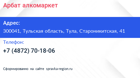 Арбат, алкомаркет по адресу 300041, Тульская область, Тула, Староникитская, 41 в дальнейшем Организация, размещена в следующих категориях: