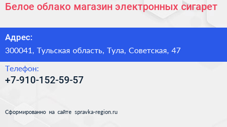 Белое облако, магазин электронных сигарет по адресу 300041, Тульская область, Тула, Советская, 47 в дальнейшем Организация, размещена в следующих категориях: