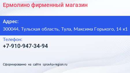 Ермолино, фирменный магазин по адресу 300044, Тульская область, Тула, Максима Горького, 14 к1 в дальнейшем Организация, размещена в следующих категориях: