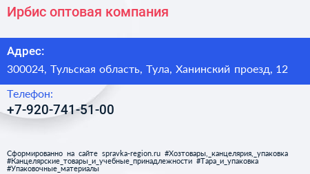 Ирбис, оптовая компания по адресу 300024, Тульская область, Тула, Ханинский проезд, 12 в дальнейшем Организация, размещена в следующих категориях: