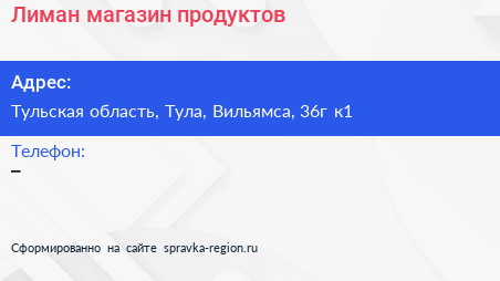 Лиман, магазин продуктов по адресу Тульская область, Тула, Вильямса, 36г к1 в дальнейшем Организация, размещена в следующих категориях: