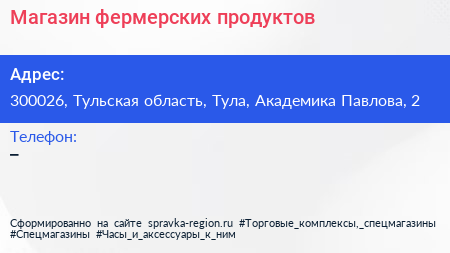 Магазин фермерских продуктов по адресу 300026, Тульская область, Тула, Академика Павлова, 2 в дальнейшем Организация, размещена в следующих категориях: