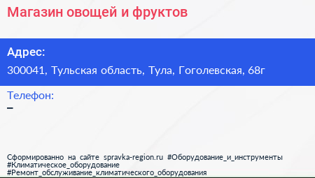 Магазин овощей и фруктов по адресу 300041, Тульская область, Тула, Гоголевская, 68г в дальнейшем Организация, размещена в следующих категориях: