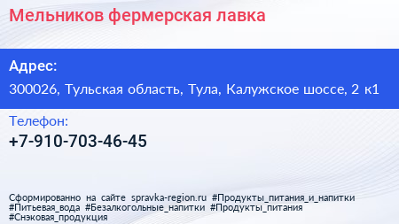 Мельников, фермерская лавка по адресу 300026, Тульская область, Тула, Калужское шоссе, 2 к1 в дальнейшем Организация, размещена в следующих категориях: