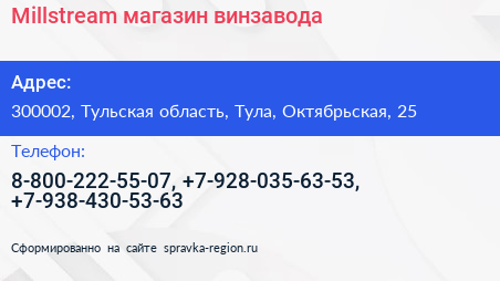 Millstream, магазин винзавода по адресу 300002, Тульская область, Тула, Октябрьская, 25 в дальнейшем Организация, размещена в следующих категориях: