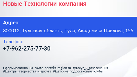 Новые Технологии, компания по адресу 300012, Тульская область, Тула, Академика Павлова, 155 в дальнейшем Организация, размещена в следующих категориях: